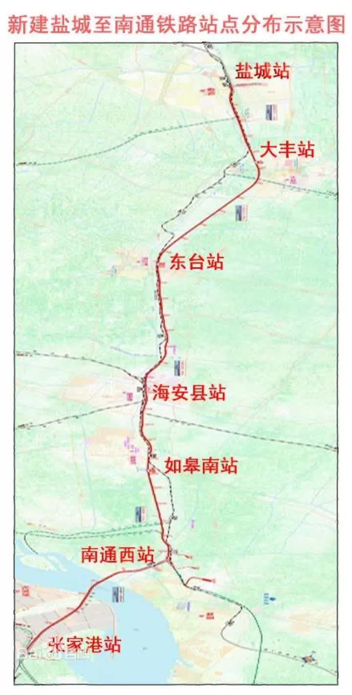 盐通铁路是国家沿海大通道的重要组成部分,线路北自盐城站引出后,向南经大丰区、东台市、海安市后继续向南走行经如皋市后,进入通州区在建沪通铁路南通西站,后与沪通铁路共通道越过长江至张家港市,接入在建沪通铁路、南沿江城际铁路共设的张家港站。力争在2020年建成通车。
